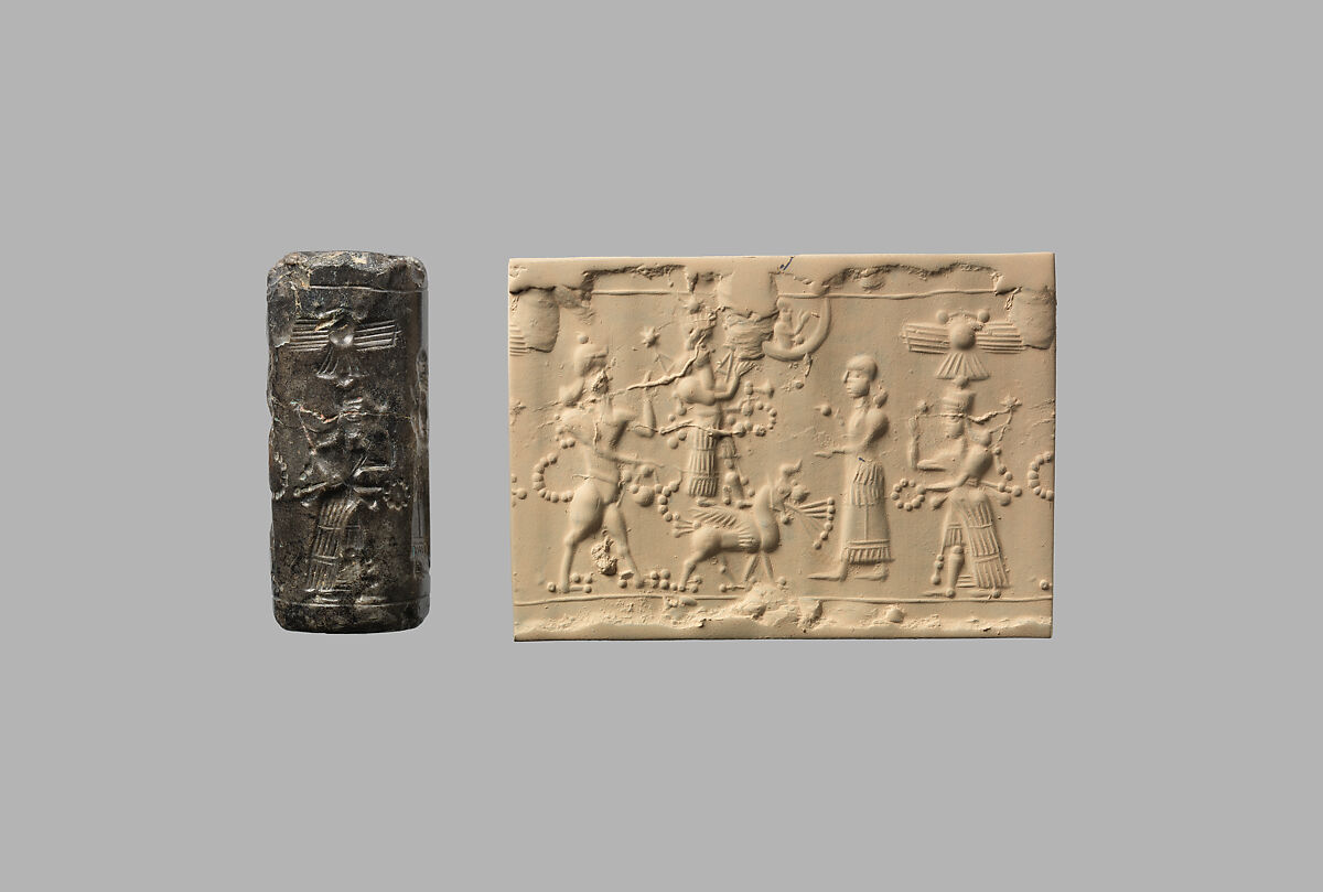 The modern impression of the seal is shown so that the entire design can be seen. This seal shows a scorpion man and male figure wearing a long garment flanking a deity standing on winged lion. The goddess Ishtar is also represented. A winged sun disc appears above her in the upper pictorial field. Above and in front of the male deity, a crescent moon with a male bust is represented.