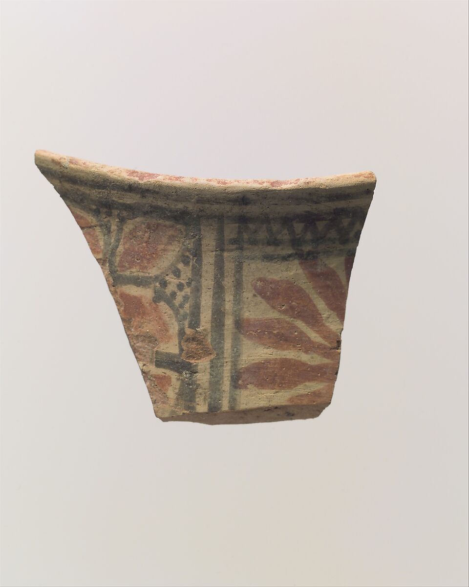 Halaf potters far surpassed their predecessors and successors in the embellishment and delicacy of their designs and the fine quality of the pottery itself. The background is often, as here, a buff color with red and black decoration produced on the vessel from the same iron oxide pigment, technically a very advanced achievement. This fragment of a vessel with slightly flaring rim has the exterior painted with parts of two black-outlined metopes, one with a red rosette, the other with a red design outlined in black, on light buff ground. A red band decorates the interior rim.