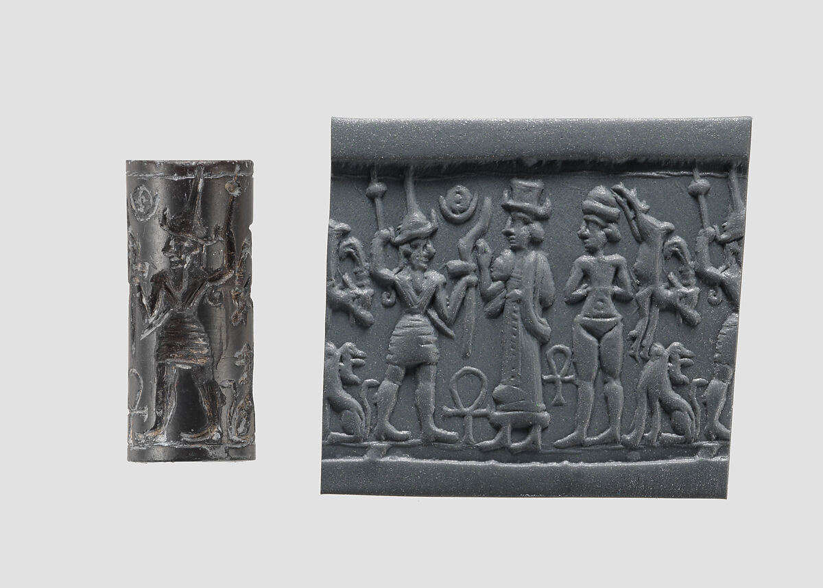 - Title: Cylinder seal and modern impression: smiting weather god before a Syrian goddess, nude goddess; ankh symbols