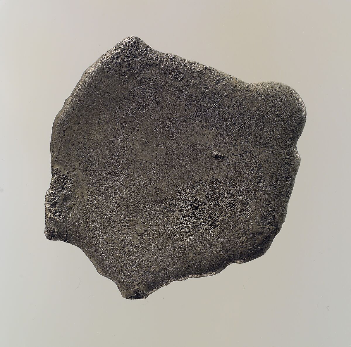 It has been suggested that the ingot belonged to a silversmith, who might have used it to make or repair jewelry, sculpture, or drinking vessels or other ceremonial containers, such as the stag-headed cup (MMA 1989.281.10) . On the other hand, we know that in the earlier Assyrian Trading Colony period specific weights of Anatolian silver were traded for the goods imported from Assyria. Perhaps this ingot, or pieces from it, were weighed and used as currency in Hittite times, since coins as we know them were only invented in the mid-seventh century B.C.