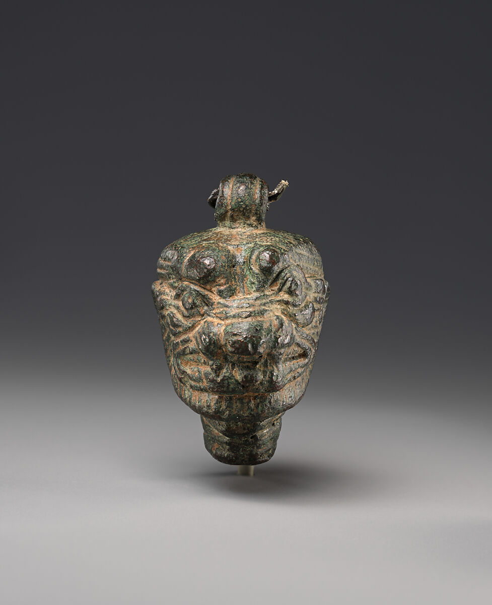 Although small, this head and neck cast in bronze is immediately recognizable as a ferocious demonic creature from ancient Mesopotamia. The bulging eyes, bulbous forehead protrusions, and short beard that rings the snarling open mouth, atop an incongruously thin neck, are unmistakable features of Pazuzu, the king of evil wind demons. Pazuzu was associated with the cold winds that blew into present-day Iraq from the Zagros Mountains on the border with Iran, which were thought to bring illness. While not a benevolent figure on his own, he could be used to deflect the dangerous attentions of Lamashtu, a powerful and violent demon. A plaque displayed in the museum was used as an amulet against Lamashtu, and depicts her as a demon combining human and animal features (1984.348). When wearing a pendant like this head threaded on a necklace, the orientation of the suspension loop would ensure that the demon’s gaze was directed outward. The wearer could thus aim the demon’s countenance at whatever dangers she or he faced in the course of daily life.