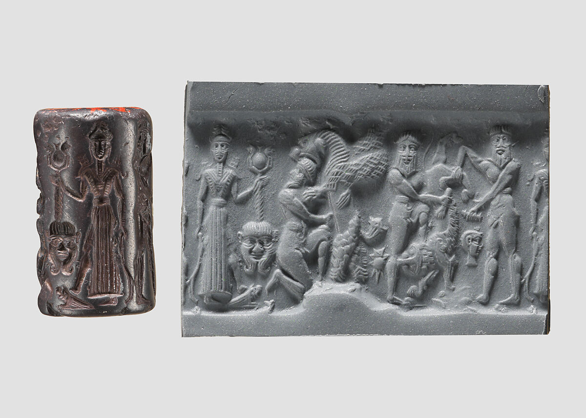 The modern impression of the seal is shown so that the entire design can be seen. This seal shows a pair of nude, belted, bearded heroes with frontal heads subduing a lion. One hero steps on the lion's neck while the second hero holds plunges a dagger into its belly. A warrior goddess stands with quivers protruding from both shoulders, holding a scepter resting on a frontal head, probably of the demon Humbaba. A kneeling bearded hero wrestles with a large lion-griffin with feathered lower body, who bites the hero's head.