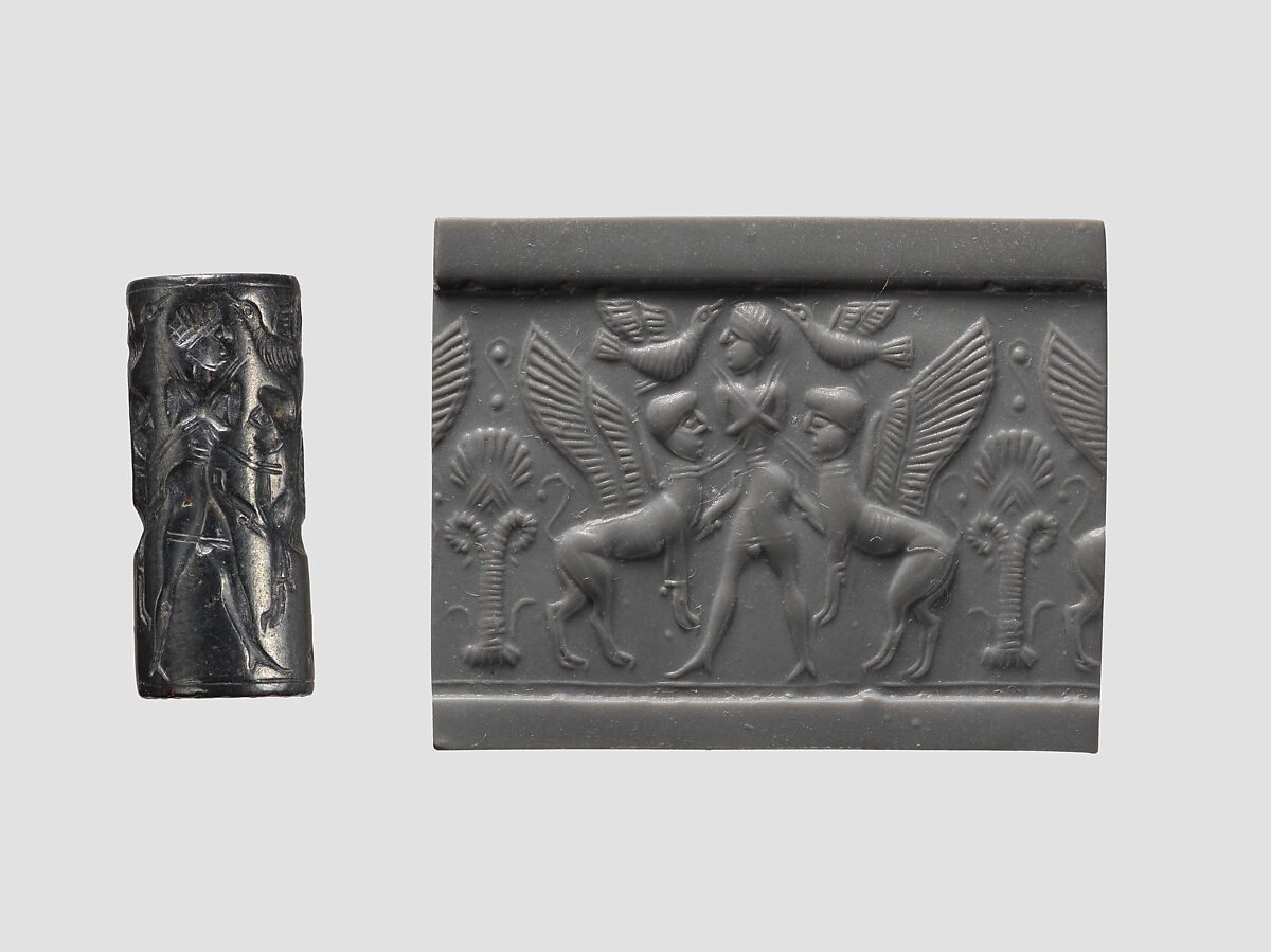 - Title: Cylinder seal and modern impression: human figure flanked by sphinxes, birds