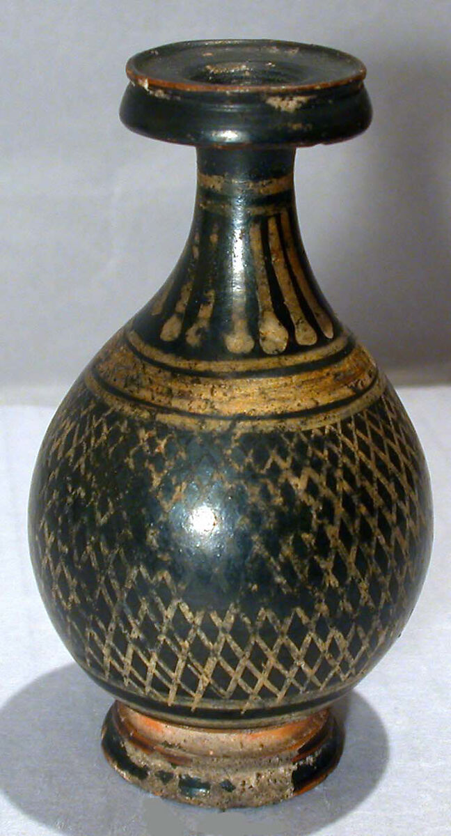 he decoration of this bottle was created by applying color on black gloss before the vase was fired, a technique characteristic of the "Gnathian style," named for the ancient site of Gnathia where many examples have been discovered. The use of yellow evokes models with gilded decoration.