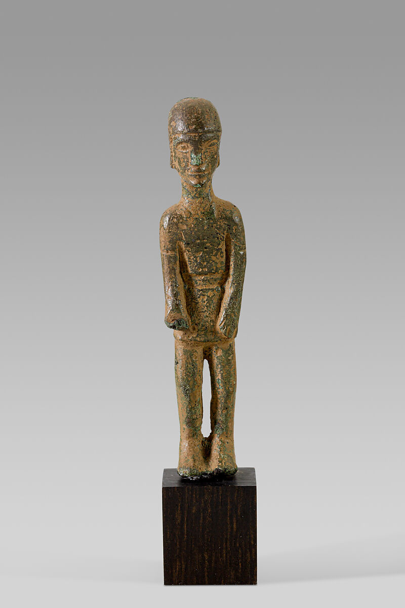 The arrangement of the broad belt, short-sleeved tunic, and pointed defensive garment covering the lower body is seen in Iberian art exclusively on warriors. This kind of costume is described by Strabo in his discussion of Iberian mercenary warriors and their dress (Strabo 3.3-4). The statuette was most likely a votive dedication, and similar examples have been found in sanctuaries on the Iberian Peninsula.