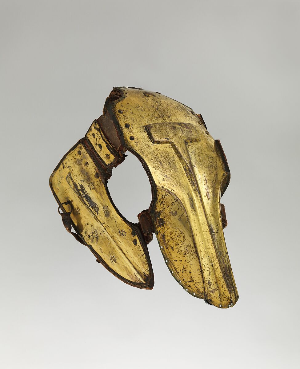 This shaffron is unusually complete and is one of the few examples to retain its original cheek plates. It is engraved with tulip designs and inscribed across the forehead: "Made at the order of Emir Yusuf."