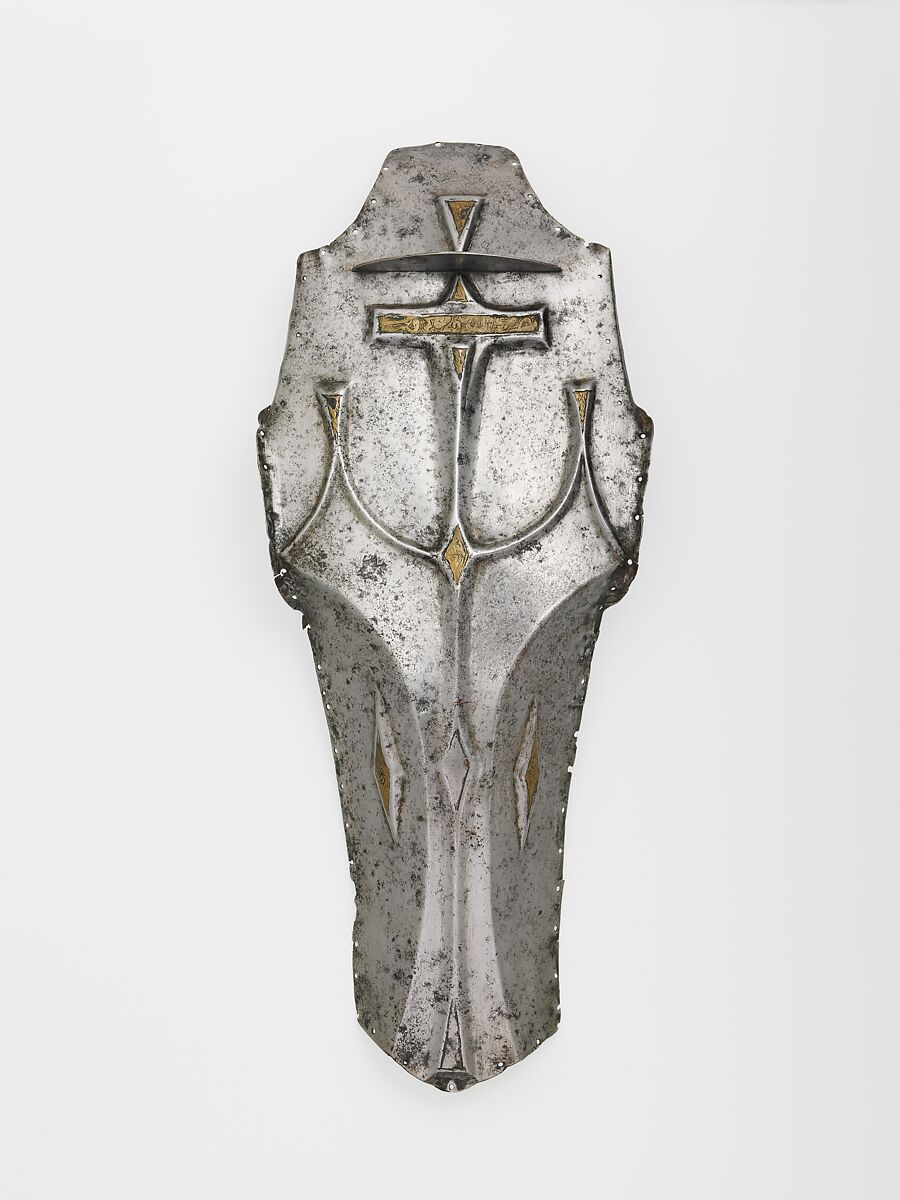 Shaffrons of this general type, with sharply cutaway semicircular sides and embossed with large T-shaped forms along the forehead and down the nose, seem to have originated in the Ottoman Empire, probably during the sixteenth century. The present example is one of several shaffrons embossed with both a T-shape and semicircular forms; one of these (also with brass inlay) is in the Askeri Müzesi, Istanbul, and another is in the Museo Stibbert, Florence. The shaffron in the Museo Stibbert, like this one, has an upstanding horizontal brow plate. It is fitted with copper rivet heads engraved with radiating spokes, a type frequently used on Mamluk and Ottoman armor of the sixteenth century, including an Ottoman "turban" helmet and a horse armor both probably of that century.