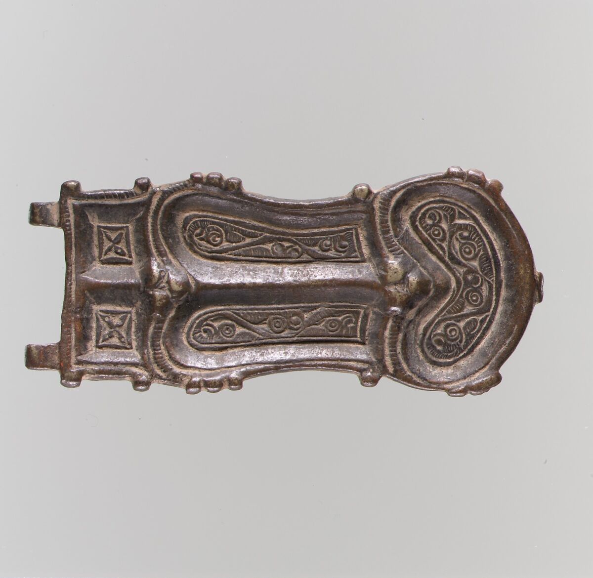 This is a buckle shank, part of an ornate belt buckle. It has sunk panels decorated with scrolls and leaves resembling bird or animal heads. It is fitted with two rings at one end for a buckle loop; five rings on the back, three of which are broken. The cast copper alloy is possibly tinned. The spring or pin is missing.