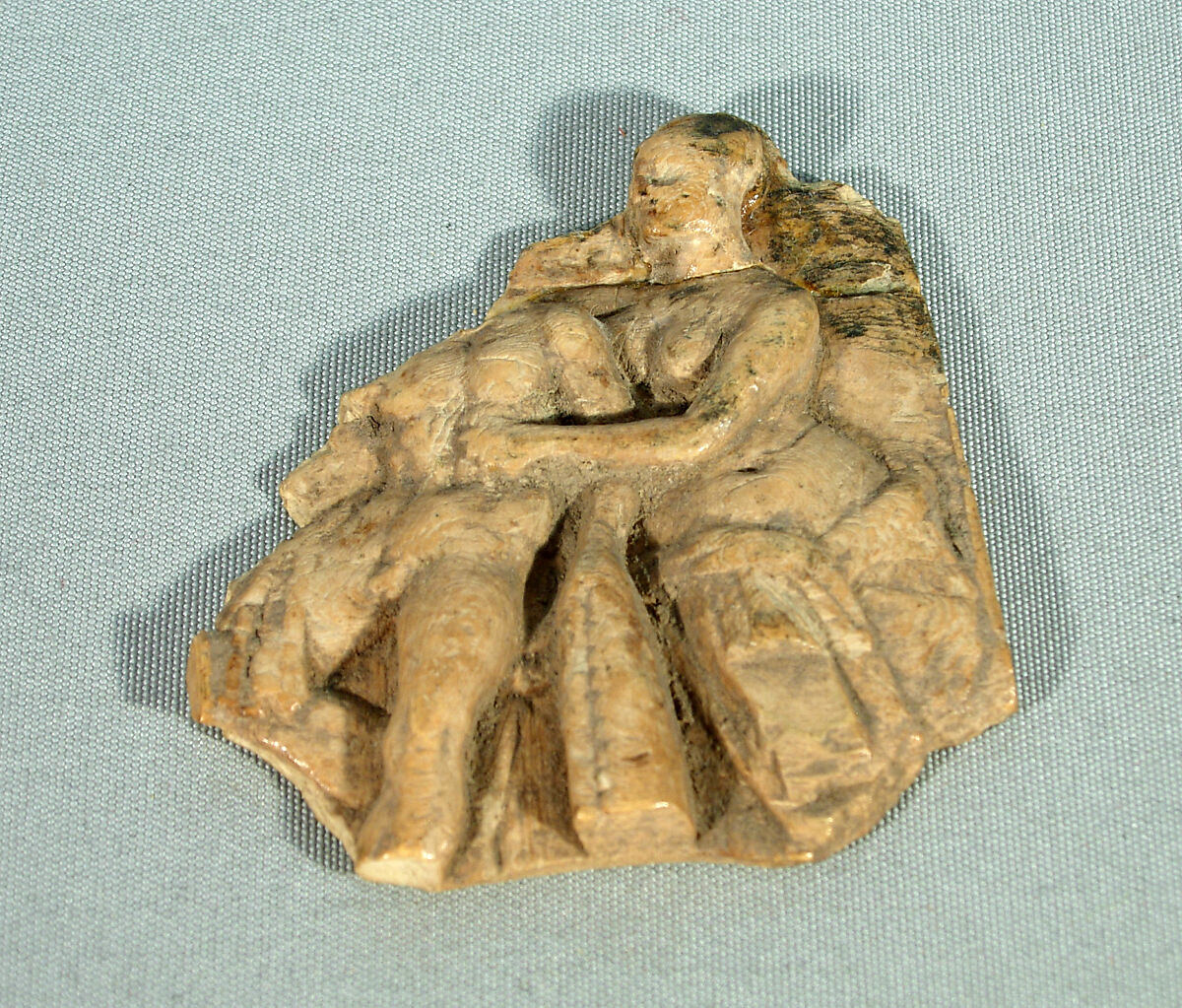 Carved in relief on one side of a bone panel, a man and woman incline toward one another. Both are preserved in a fragmentary state. What remains of the man’s nude body is, however, carved with careful attention to proportion and musculature. The woman turns toward her partner; her facial features and hair are worn smooth, perhaps as a result of use. The woman’s seemingly intimate embrace contributes to the panel's long-standing designation as a pair of lovers. In contrast to her partner, the woman’s draped lower body may convey modesty, as seen, for example, in the so-called Venus "Pudica Type."