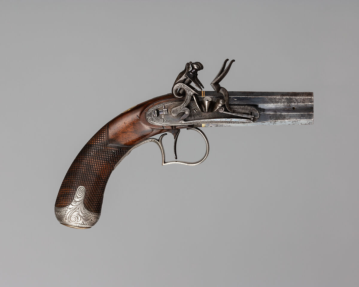Diminutive in size and elegant in form, small side-lock pistols like this one were one of Joseph Egg’s specialties, prized for their precision craftsmanship and jewel-like quality, as well as their convenience as pocketable weapons. Its novel single-trigger mechanism, designed by Egg, allowed for the barrels to be fired in succession with two pulls of the trigger. Egg made similar pocket pistols for the Prince of Wales after he became Prince Regent and his younger brother, Prince Frederick Augustus, Duke of York and Albany (1763–1827). This particular pistol belonged to a member of a Welsh royal family, Hughes of Gwerclas, whose arms are engraved on the gold pommel cap.