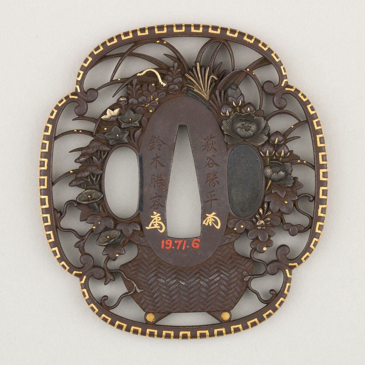 This is the smaller guard (tsuba) of a pair of sword guards that is the product of a collaboration among three artists. The father and son Hagiya Katsuhira (萩谷勝平, 1804–1886) and Suzuki Katsuhiro (鈴木勝容, 1827–1886) made the smaller guard, for the wakizashi, in 1860. It features an extraordinary openwork design of a flower basket whose quatrefoil rim is decorated with a Greek-style key pattern inlaid in gold. Ishiguro Masaaki (石黒政明, born 1813) crafted a larger guard (acc. no. 19.71.7) of the same design to create a matching set for the traditional pair of swords worn by a samurai .