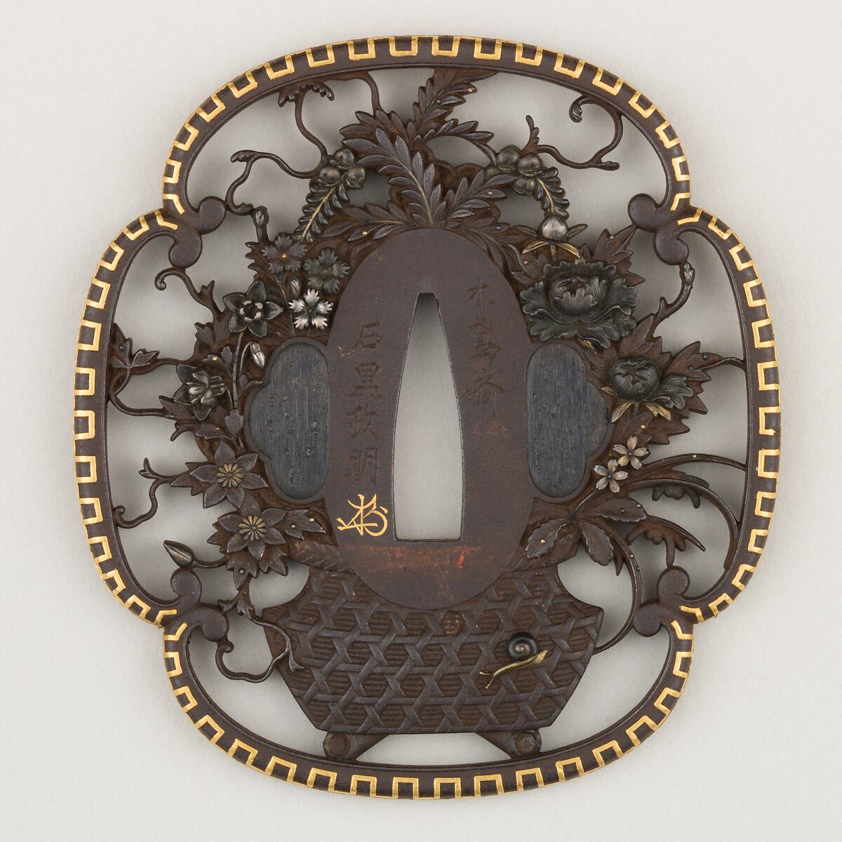 This is the larger guard (tsuba) of a pair of sword guards that is the product of a collaboration among three artists. Ishiguro Masaaki (石黒政明, born 1813) crafted it after a smaller guard (19.71.6) of the same design to create a matching set for the traditional pair of swords worn by a samurai . It features an extraordinary openwork design of a flower basket whose quatrefoil rim is decorated with a Greek-style key pattern inlaid in gold. The smaller guardm for the wakizashi, was made by father and son Hagiya Katsuhira (萩谷勝平, 1804–1886) and Suzuki Katsuhiro (鈴木勝容, 1827–1886) in 1860.