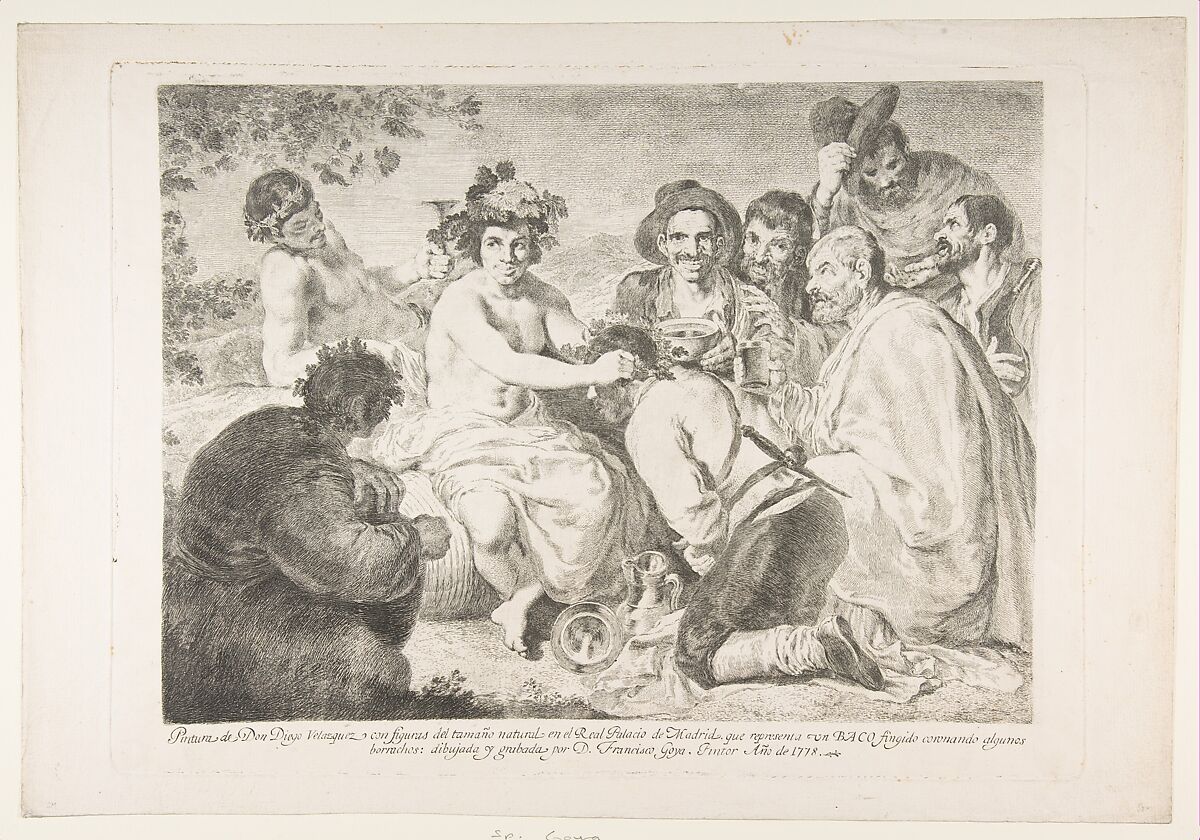 Rendering Velázquez’s complex composition in etching presented Goya with a considerable challenge. His determination to analyze and understand the painting—its interlocking forms and varied expressions—is evident in his preparatory drawing. Notwithstanding Goya’s careful observation, both the drawing and the print depart from the model. In the print, the figures are distinctly rougher and more brazen. Velázquez’s Bacchus is a fleshy, distracted youth, shown crowning a figure who kneels before him. Goya rendered the god as more mature and shrewd, in league with those around him, whose inebriation is also more pronounced. These modifications appear intentional; Goya may have felt empowered to submit his own reading, just as Velázquez did by surrounding his classical god with figures that were recognizably of the seventeenth century.