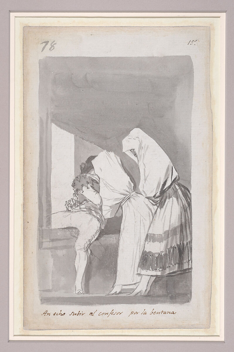 - Title: Two women helping a confessor to climb through a window; folio 78 (verso) from the Madrid Album "B"