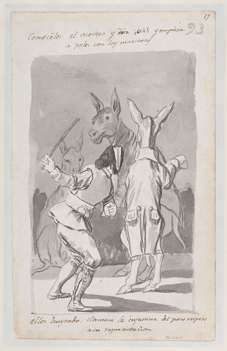 This is the last known sheet from Goya’s second album, and the captions are among the longest he wrote, reflecting an urge to clarify complex scenes. Here, an oil vendor discovers that the well-dressed asses are impostors and, much to their chagrin, canes them. Without the complicated inscription, the scene would be impenetrable. The young woman in the drawing on the reverse side of the sheet throws a tantrum while Father Pichurris ("Father Whoever"), who has commented on her appearance, stands in the background. The idea is that she is so vain that remarks made even by an unknown priest are enough to provoke her fury.