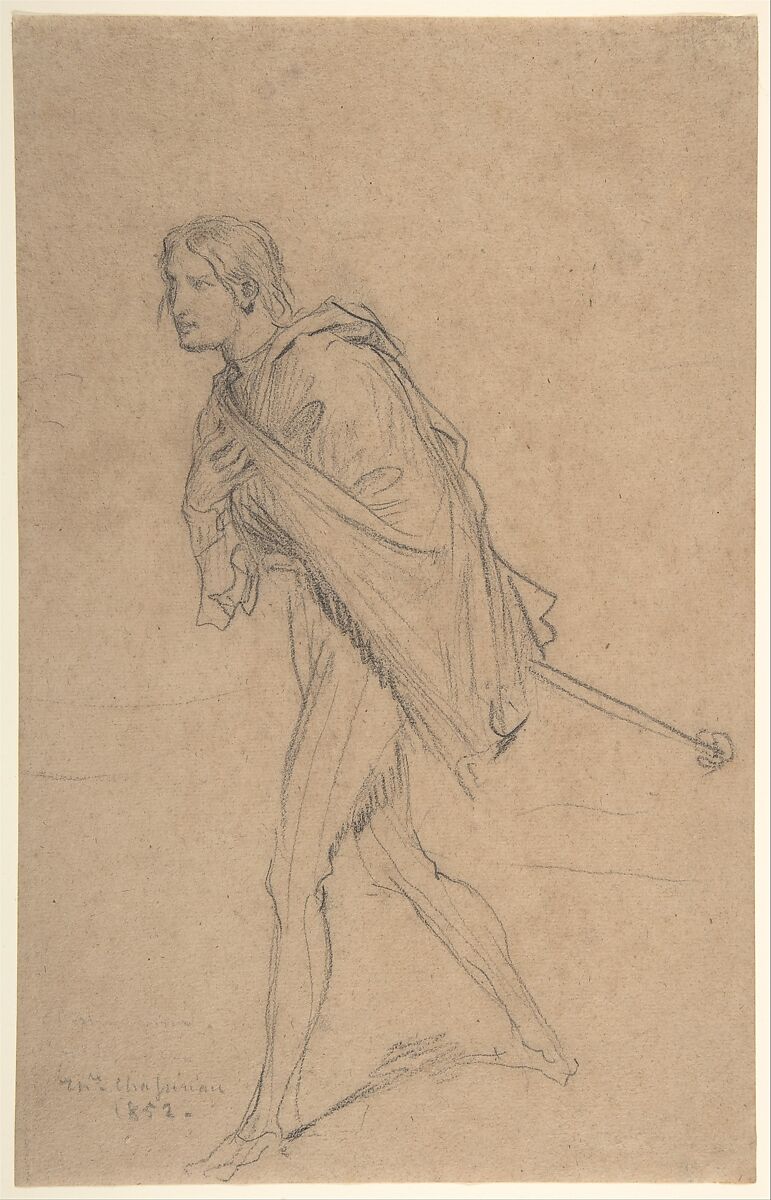 Between 1852 and 1855 Chassériau returned to Shakespearean themes in his paintings and drawings, using an 1844 series of fifteen etchings devoted to Othello as a starting point. This image of Cassio relates to plate 6, where Desdemona tells Cassio that she will plead his cause with her husband (see: 64.599.1).
