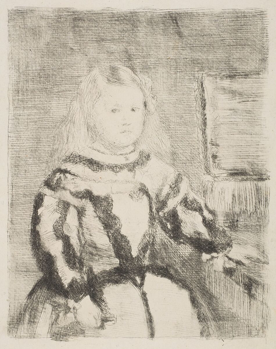 Degas was still relatively new to the practice of etching when he undertook this work, but he would become one of his century's greatest printmakers. Both he and Manet followed the etching practices of Goya (also a copier of Velázquez), clumping together masses of brittle, parallel lines.
