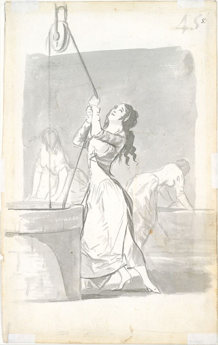 As with several drawings from Album B, the same figure appears on both sides of this sheet. On the front, a young woman with a joyful expression pulls water from a well while her companions in the background wash laundry. On the other side, the same woman gazes sadly into the well. The two scenes—of first happiness, then disillusionment—might relate to a popular Spanish saying: 'mi gozo en un pozo' (my joy in a well).