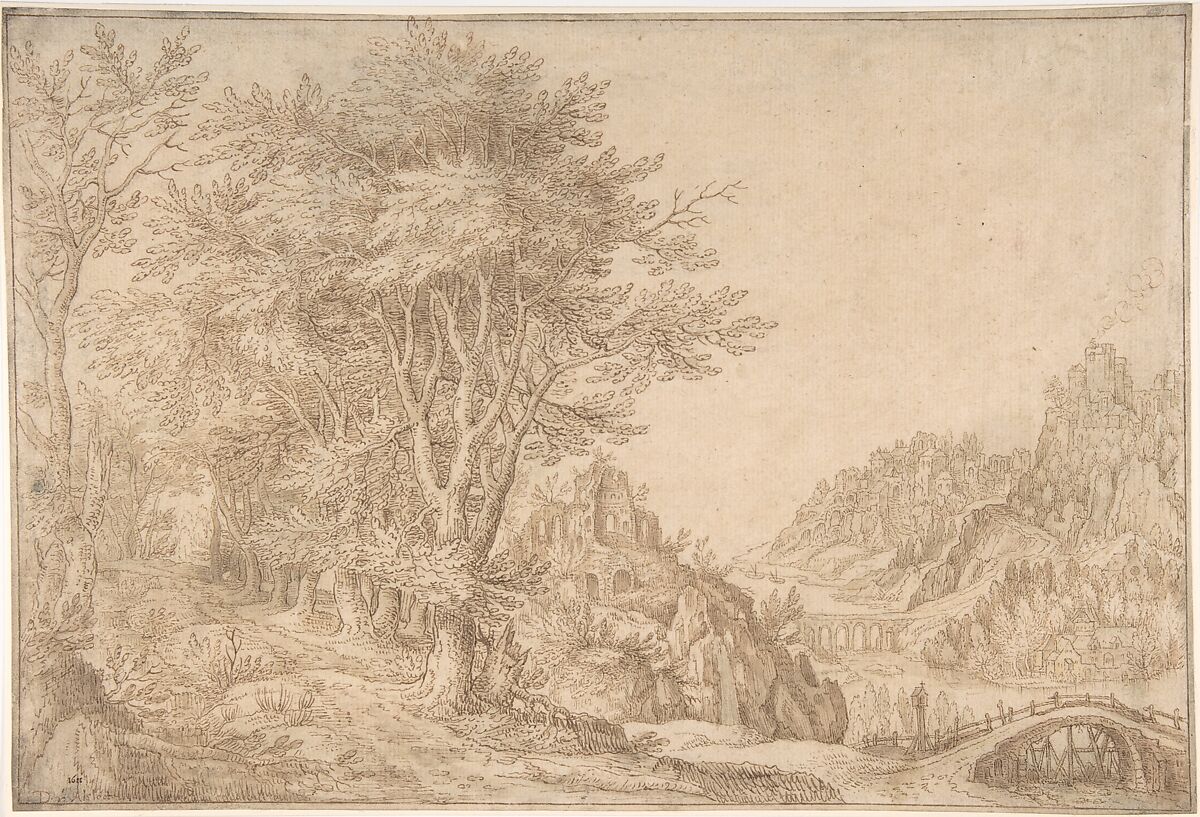 Since van Alsloot’s style is strongly reminiscent of that of Brueghel and other contemporary Netherlandish landscapists, his work has often been confused with that of other artists. This sheet, however, leaves no room for doubt. According to Sabine van Sprang, the author of the 2014 monograph on van Alsloot, The Museum's sheet is an autograph copy of an earlier version, signed and dated 1608, which is held in Wolfegg.[1] The compositions are nearly identical, except for the clouds in the sky of the Woldegg drawing. Both are related to a painting by van Alsloot, dated 1610 (Antwerp, Koninklijk Museum voor de Schone Kunsten, oil on panel, 101 × 135 cm, inv. no. 865). The painting shows the nearly exact same landscape which now functions as the backdrop for the story of Tobias and the Angel.