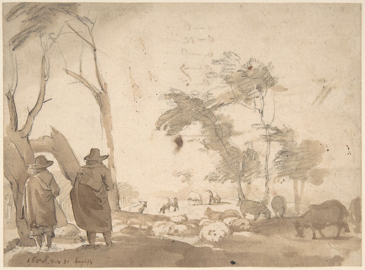 - Title: Landscape with Sheep and Two Figures (recto); Faint Sketch of a Figure with a Hat (verso)