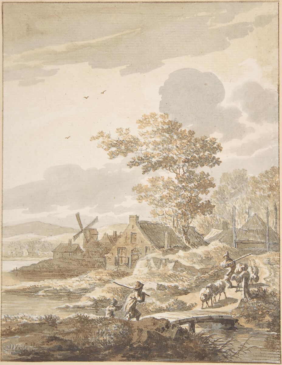 - Medium: Pen and brown ink, brush and gray and brown wash, over graphite; framing lines in pen and brown ink