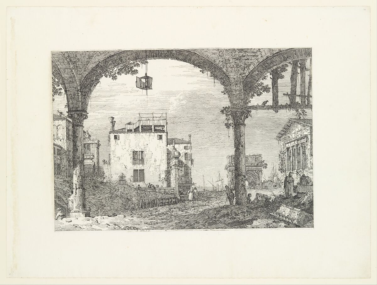 - Title: A three-arched portico with an open lantern hanging at center, a triumphal arch and ruins of a classical temple in the background, from "Views" (Vedute altre prese da i luoghi altre ideate da Antonio Canal)