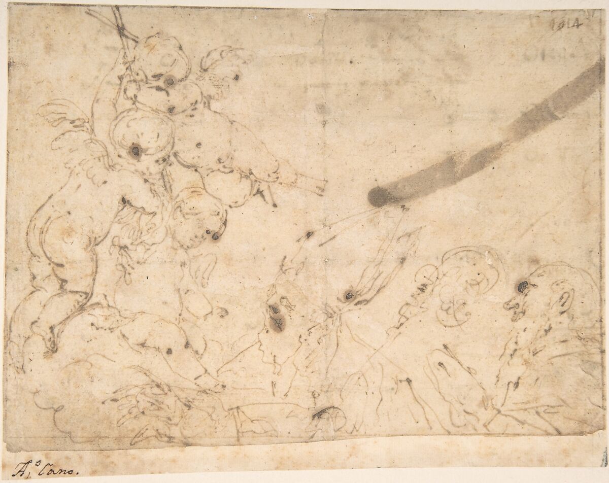 - Medium: Pen and medium brown ink over traces of black chalk underdrawing on cream paper. Lightly foxed. Composition outlined with pen and medium brown ink. Lined with a strip of paper showing at bottom