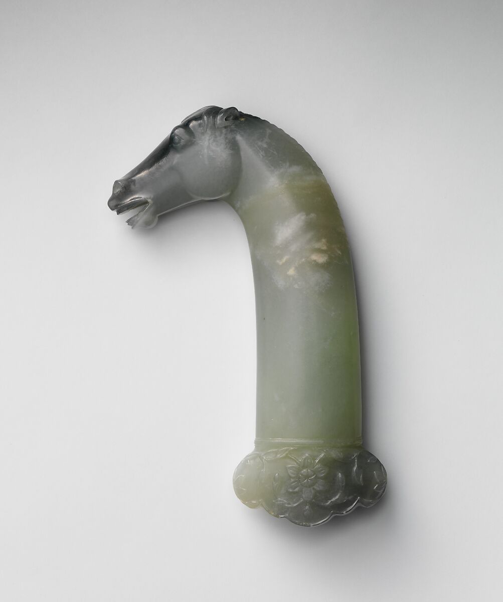 Horse-head dagger hilts are first depicted in paintings of the Padshahnama (Chronicle of the King of the World), about 1635, a manuscript documenting the reign of the Mughal emperor Shah Jahan (r. 1628–58). As horses were highly prized in Mughal culture, it is not surprising that horse-head daggers were the most popular subject for zoomorphic hilts for several centuries. This example is notable for its sensitive carving of the horse’s head and mane.