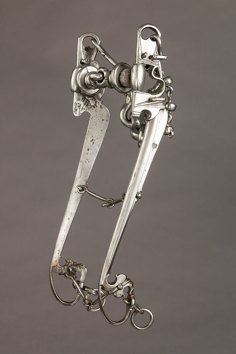 According to contemporary equestrian manuals this bit would have been used on a young horse still under training. This is indicated by the use of a mouthpiece without high port (allowing the horse to cushion the bit with its tongue, protecting the bars, the part of the jaw without teeth, to be constantly in contact with the rollers), combined with two long ‘weak’ shanks. The term ‘weak’ means that the swivel ring’s hole for the reins is placed behind the axis of the banquet (piece to which the mouthpiece is attached). Weak shanks, having a lower leverage effect, were used on horses lowering their head and nose too much. The banquets can also be opened to switch out the mouthpiece, a feature particularly appreciated on dressage bits in Germany.