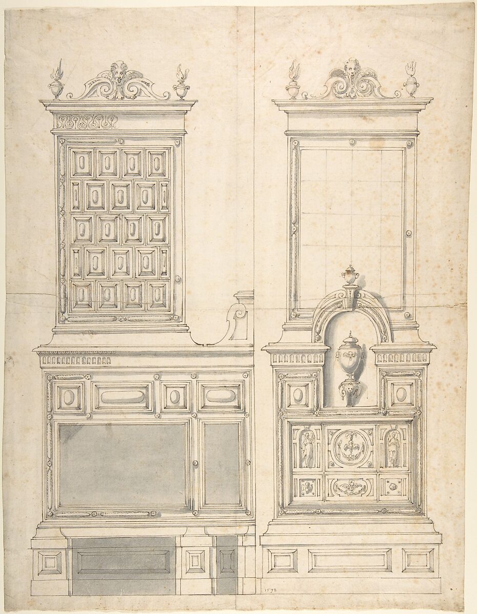 This sheet contains two drawings separated by a thin vertical line in the middle. It is not entirely clear whether they represent two views of the same object, or whether they in fact show two different elements of an interior. The design on the left is clearly recognizable as the side elevation of a large stove, typical for Central Europe from the late Middle Ages onward. The design on the right could be one of two things. It might be a frontal view of the same stove, outfitted with a niche and vessel to supply hot water. Although ingenious, this does not appear to have been common at the time however. It might therefore sooner have to be considered as a separate design for a wall fountain or lavabo. From contemporary views of interiors it is known that the combination of stove and lavabo was often found in the bedroom and it was not uncommon to match their designs in the endeavor to create some unity in the style of the interior.