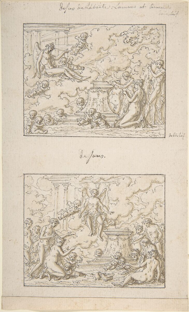- Medium: Pen and dark brown ink, brush and light brown wash, over black chalk, with framing lines around each design