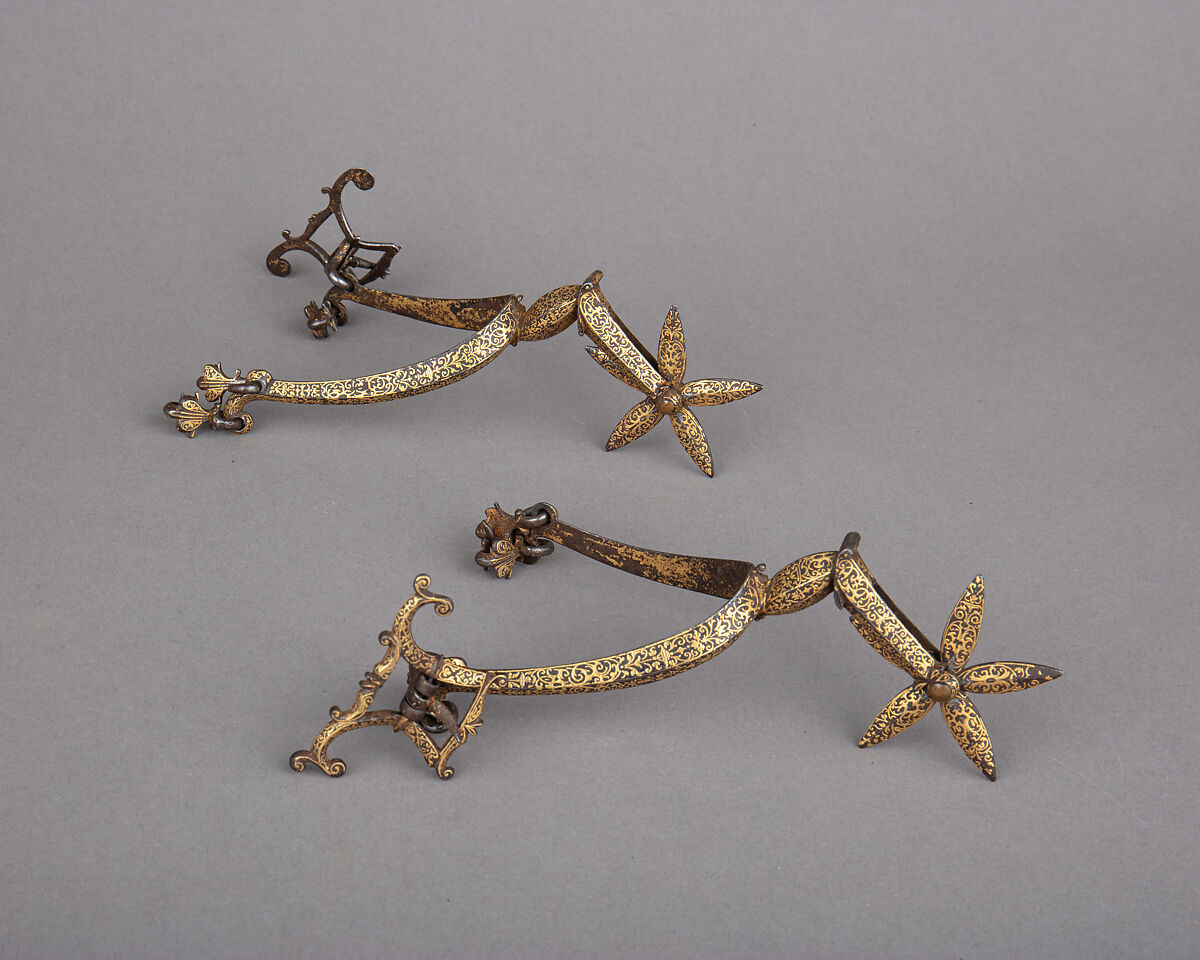 This pair of spurs is decorated overall with a gold damascened grotesque decoration featuring motifs of a kind of organic strapwork style called Schweifwerk. This style, popular in the German and Dutch-speaking lands, as we see for example on the ornament prints made by the Dutch artist Esaias van Hulsen, was also practiced by some other artists in Europe, particularly in France, including the designs made by the French Jacques Hurtu and Etienne Carteron.