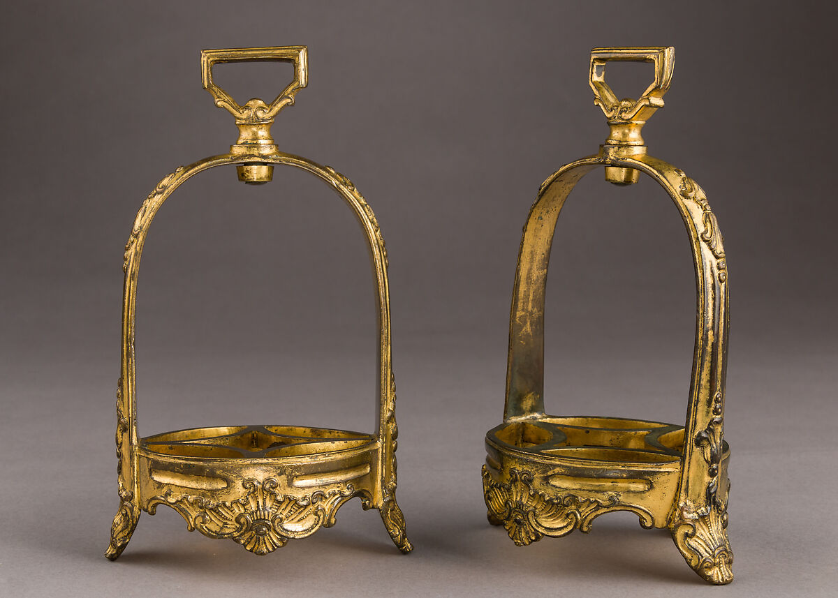 This gilded pair of stirrups, decorated with rococo designs, is an early form of the typical 'bell stirrups' (estribos campana), a type that would become particularly popular in Argentina from the 19th century onwards. Such stirrups were introduced in South America through Jesuit missions in the 18th century.