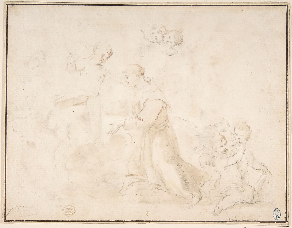 - Medium: Black chalk with brush and brown wash over black chalk on off-white washed prepared paper; framing lines in pen and dark brown ink