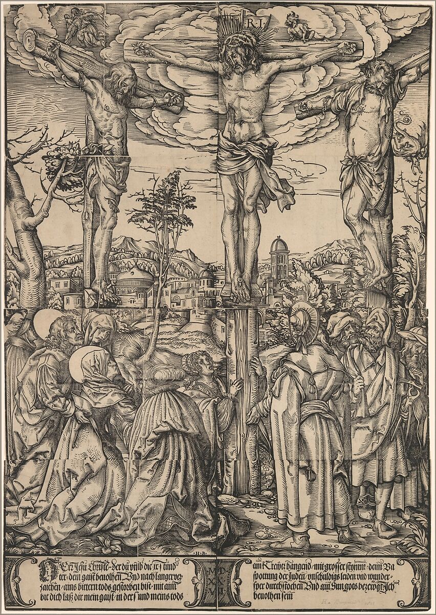 Burgkmair created this impressive depiction of the Crucifixion from eight woodblocks printed on eight sheets of paper that were later assembled to form a single image. Large woodcuts such as this were meant to be hung on walls. They were intended not only for private devotional use but were also displayed in such public spaces as churches. As a result they are very rare; only three other impressions of this print are known. This is one of four such large eight-sheet prints by the artist; also in the Metropolitan Museum's collection is the large Adam and Eve (49.95.150) dated two years earlier.
