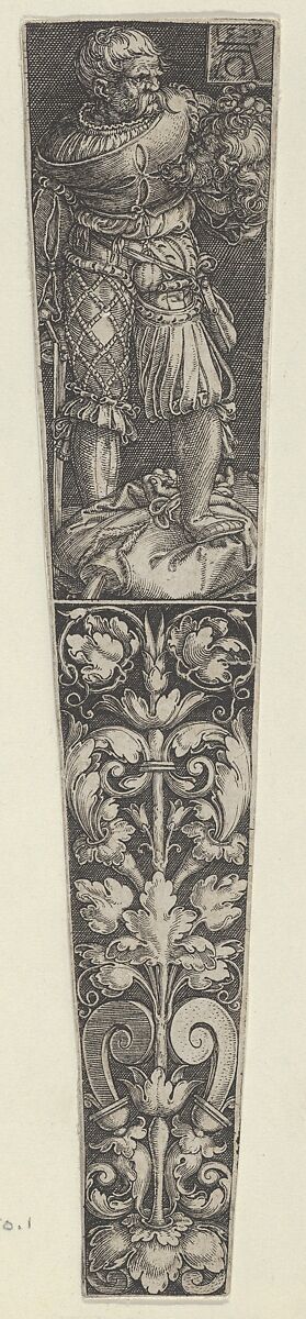 Horizontal panel with design for a dagger sheath, with a scene at top showing the executioner holding the head of John the Baptist in his left hand while stepping on the body below. Under this scene is a candelabrum with scrolling tendrils and strapwork.