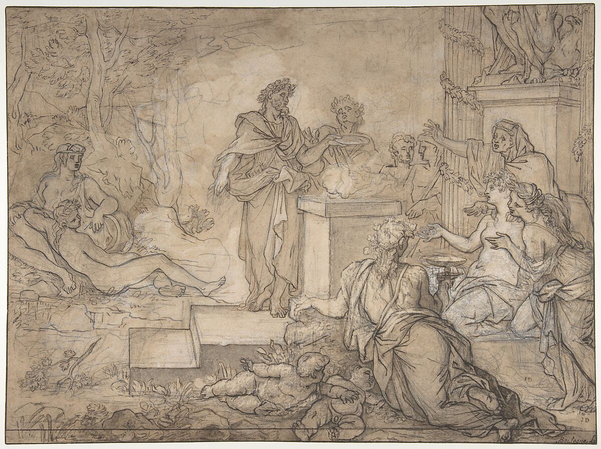 In this vigorous drawing, the artist used a strong ink line to emphasize the elegant contours of the figures, which he then heightened with thinned white gouache. The translucent white washes allow the free black chalk underdrawing to show through, adding to the appeal of the sheet. Figures draped and coiffed in a Roman style are arranged in a sober antique architectural setting, indicated only by two steps, a sacrificial altar, and two fluted columns. A statue of Jupiter, cropped at the knees, but recognizable by his attribute of the eagle, presides over the scene. A priest performs a libation at the altar while a range of spectators look on. Throughout, the treatment of the faces is idiosyncratic, with angular, expressive features.