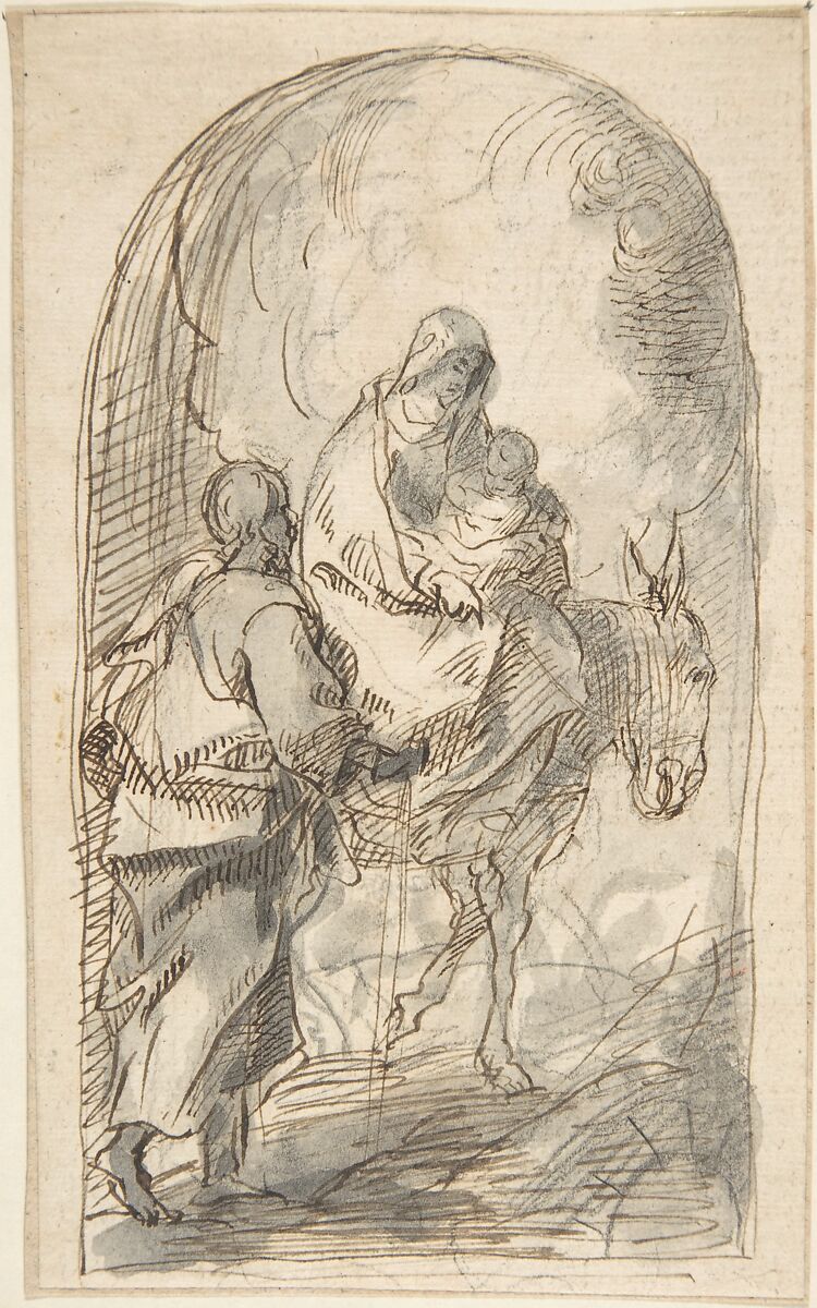 - Medium: Pen and dark brown ink, brush and gray wash, over black chalk underdrawing. Outline of arch-shaped composition in the same pen and brown ink. On off-white paper