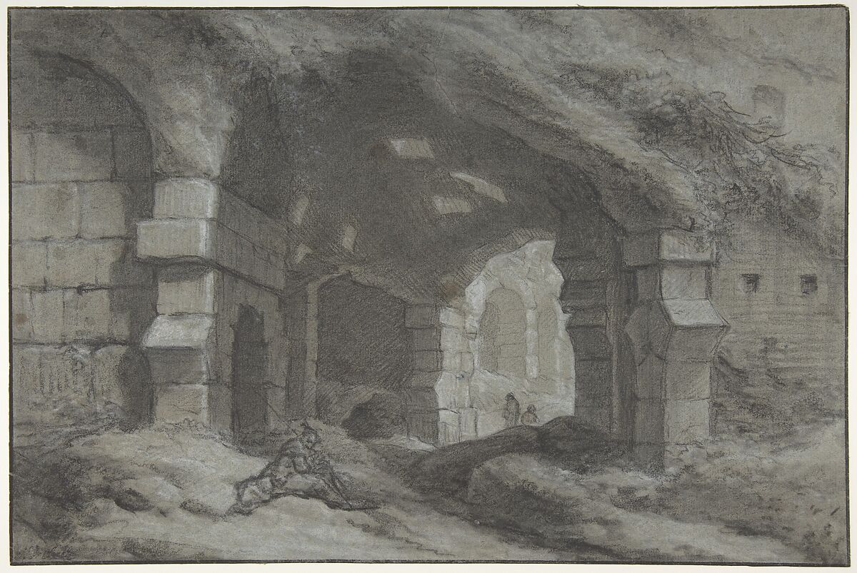- Medium: Black chalk, heightened with white on gray-blue paper; framing lines in pen and brown ink. Verso: faint black chalk sketch of an arch