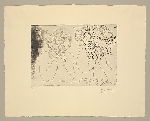 Marie-Thérèse Walter, in profile at left, watches over this curious scene of a young man partially hidden by a bull's mask sitting next to another figure, who is completely hidden by the mask of a drunken faun. It has been speculated that the figure behind the faun is the old sculptor from Picasso's Vollard Suite, thus supporting a recurring theme in his work: youth and virility versus age and impotency.