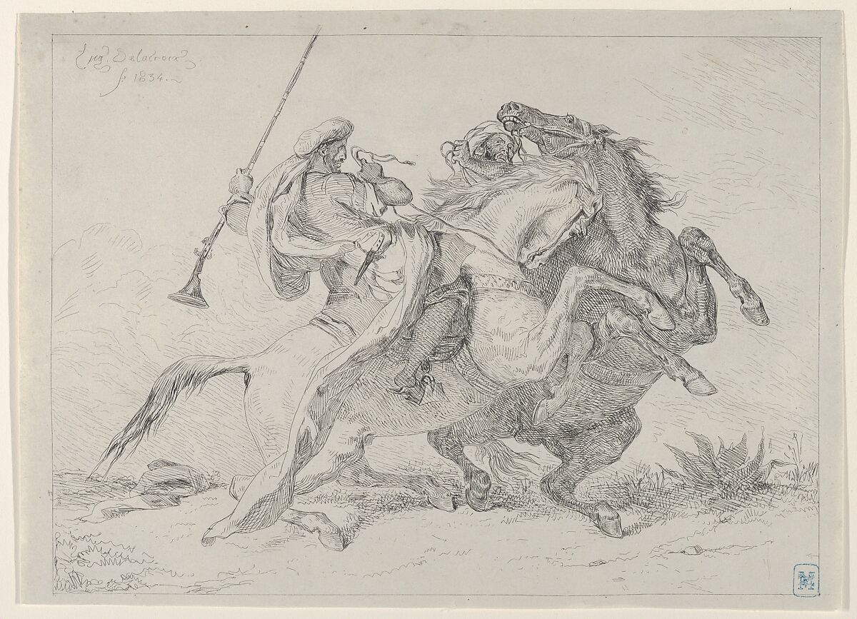 Delacroix's etching and his painting of this subject (which was rejected for the Salon of 1834) are based on an incident the artist witnessed near Tangier in 1832 and described as follows: "During [the Arabs'] military exercises, which consist of riding their horses at full speed and stopping them suddenly after firing a shot, it often happens that the horses carry away their riders and fight each other when they collide."