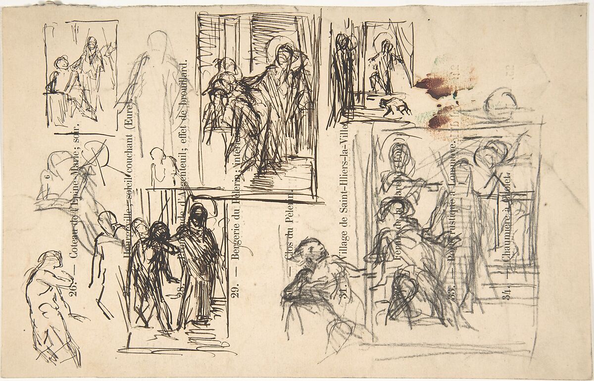 - Medium: Black chalk and pen and brown ink on wove paper (possibly a page from a Salon catalogue: numbered page 6, with cat. nos. 26-34)
