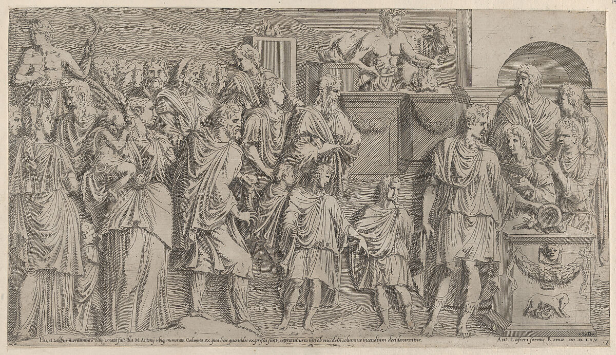 - Title: A Sacrifice, copied from a relief on Trajan's Column, from "Speculum Romanae Magnificentiae"
