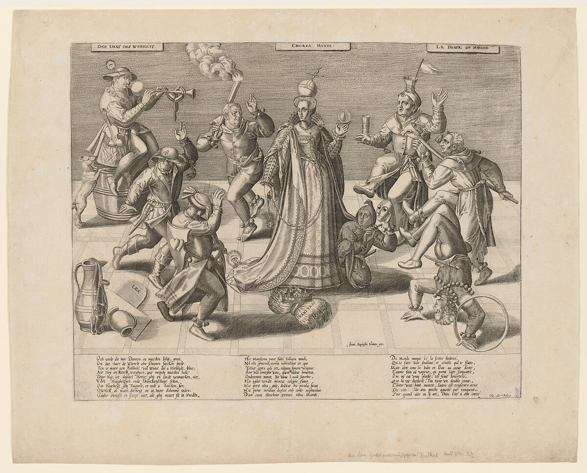 In this print, dancing serves as an allegory of the foolish behavior that worldly pleasures—as personified by the sumptuously dressed woman at center—are wont to inspire. The figures’ ungainly movements and implied consumption of alcohol have culminated in knocking a tablet labeled LEX (law) to the floor, underscoring their disregard for morality and decorum. The verses below the image cite drink, ambition, and lust as chief drivers of their profligacy.