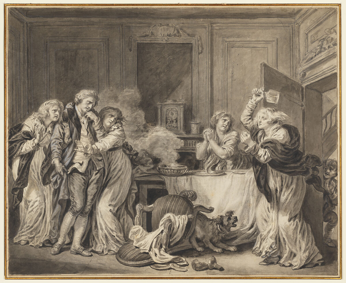 Greuze achieved success with his paintings of everyday life that emphasized moral values. This scene of domestic chaos, which the artist drew as a model for an engraving, refers to episodes from his own life. About the time he executed this drawing, Greuze recounted instances of his wife’s violent outbursts in the deposition he made to obtain a legal separation. Here, wild-eyed and wielding a decanter above her head, she bursts into the room to accost her husband, who cowers between his daughters at left. The barking dog, broken bottle, overturned chair, and steaming dish all signal the disarray of the household. The contrasting manners of husband and wife also invert the "natural" gender roles assigned by Enlightenment thinkers.