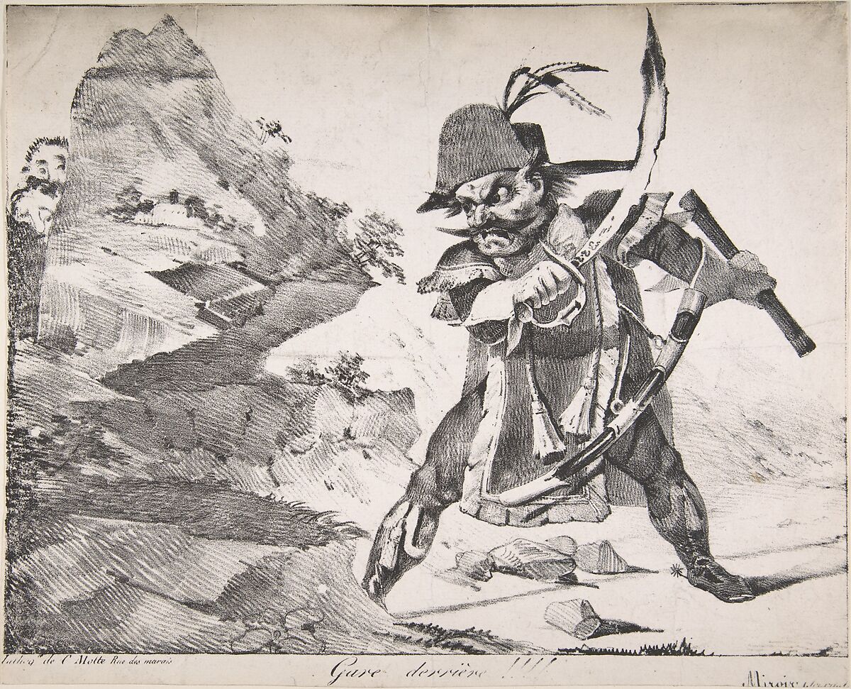 Delacroix's political satire takes aim at censorship of the French press during the 1820s. In the explanatory text that accompanied the print in the leftist newspaper Le Miroir, the wild-eyed policeman wielding a sword is called De Monts-coupés (Of Cut Mountains), a name closely evoking the phrase de mots coupés (of cut words).Executing the verdicts of the censors, he furiously raises his sword at a mountain that is labeled Fantôme (Ghost) in a reference to the censors' often imaginary fears of objectionable material. Members of the censorship committees, which were disbanded in 1822 as part of even more restrictive press laws, hide behind the mountain. Delacroix regularly drew inspiration from the earlier British satires that circulated in France. In this case, he looked to a 1799 print by Isaac Cruikshank called General Swallow Destroying th French Army for the main figure.