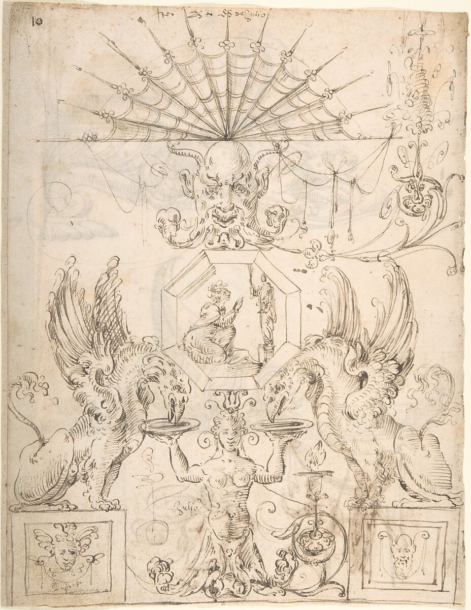 - Title: Griffins, female grotesque, mask and figures (recto); two turtle-like creatures and a scene with figures (verso)