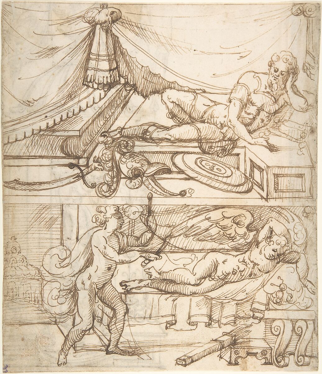 - Title: Two scenes; a reclining warrior above, sleeping cupid below (recto); grotesque niche with standing warrior (verso)