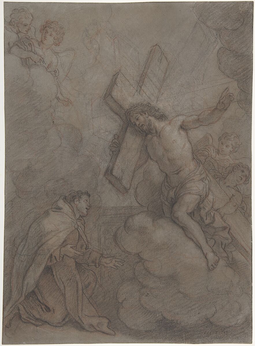 - Medium: Black chalk, over red chalk, heightened with white on gray paper