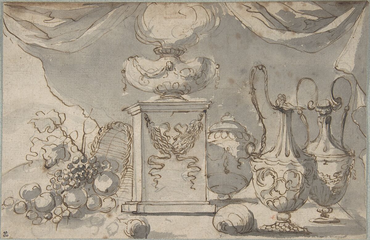 - Title: Still Life: Vases, a Cassolette on a Pedestal, and an Overturned Basket of Fruit